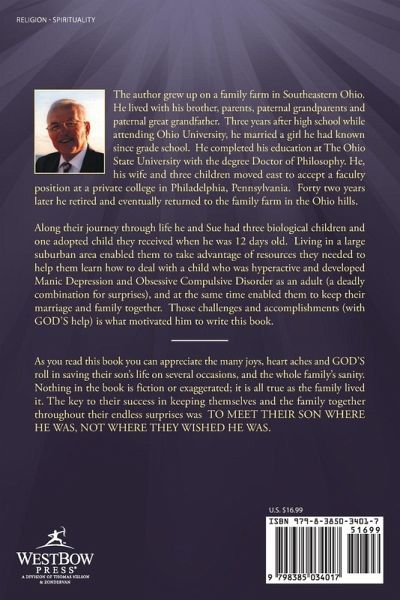 As you read this book you can appreciate the many joys, heart aches and GOD'S roll in saving their son's life on several occasions, and the whole family's sanity. Nothing in the book is fiction or exaggerated; it is all true as the family lived it. The key to their success in keeping themselves and the family together throughout their endless surprises was TO MEET THEIR SON WHERE HE WAS, NOT WHERE THEY WISHED HE WAS.