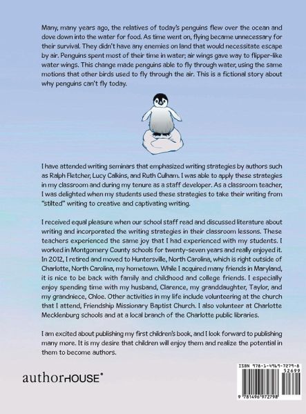 Many, many years ago, the relatives of today's penguins flew over the ocean and dove down into the water for food. As time went on, flying became unnecessary for their survival. They didn't have any enemies on land that would necessitate escape by air. Penguins spent most of their time in water; air wings gave way to flipper-like water wings. This change made penguins able to fly through water, using the same motions that other birds used to fly through the air. This is a fictional story about why penguins can't fly today.
