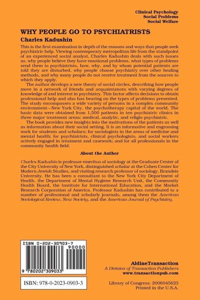 This is the first examination in depth of the reasons and ways that people seek psychiatric help. Viewing contemporary metropolitan life from the standpoint of an experienced social analyst, Charles Kadushin deals with such issues as, why people believe they have emotional problems, what types of problems send them to psychiatrists, how, why, and by whom potential patients are told they are disturbed, why people choose psychiatry over other healing methods, and why many people do not receive treatment from the sources to which they apply. The author develops a new theory of social circles, describing how people move in a network of friends and acquaintances with varying degrees of knowledge of and interest in psychiatry. This factor affects decisions to obtain professional help and also has bearing on the types of problems presented. The study encompasses a wide variety of persons in a complex community environment--New York City, the psychotherapy capital of the world. The basic data were obtained from 1,500 patients in ten psychiatric clinics in three major treatment areas medical, analytic, and religio-psychiatric. The book provides new insights into the motivations of the patients as well as information about their social setting. It is an informative and engrossing work for students and scholars; for sociologists in the areas of medicine and mental health; for psychiatrists, clinical psychologists, and social workers actively engaged in treatment and casework; and for all professionals in the community health field.