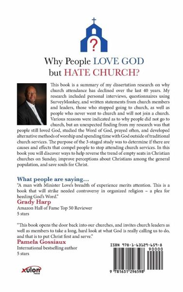 This book is a summary of my dissertation research on why church attendance has declined over the last 40 years. My research included personal interviews, questionnaires using SurveyMonkey, and written statements from church members and leaders, those who stopped going to church, as well as people who never went to church and will not join a church. Various reasons were indicated as to why people did not go to church, but an unexpected finding from my research was that people still loved God, studied the Word of God, prayed often, and developed alternative methods of worship and spending time with God outside of traditional church services. The purpose of the 3-staged study was to determine if there are causes and effects that compel people to stop attending church services. In this book you will discover ways to help reverse the trend of empty seats in Christian churches on Sunday, improve perceptions about Christians among the general population, and save souls for Christ.