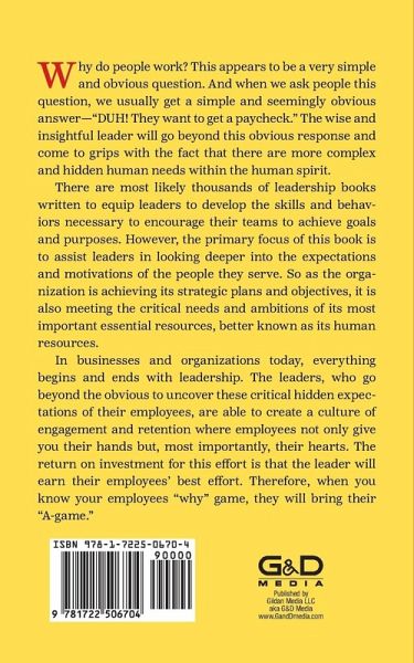 Why do people work? This appears to be a very simple and obvious question. And when we ask this question to people, we usually get a simple and seemingly obvious answer - "DUH! They want to get a paycheck." The wise and insightful leader will go beyond this obvious response and come to grips with the fact that there are more complex and hidden human needs within the human spirit. There are most likely thousands of leadership books written to equip leaders to develop the skills and behaviors necessary to encourage their teams to achieve goals and purposes. However, the primary focus of this book is to assist leaders in looking deeper into the expectations and motivations of the people they serve. So as the organization is achieving its strategic plans and objectives, it is also meeting the critical needs and ambitions of its most important essential resources, better known as its human resources. In businesses and organizations today, everything begins and ends with leadership. The leaders, who go beyond the obvious to uncover these critical hidden expectations of their employees, are able to create a culture of engagement and retention where employees not only give you their hands but, most importantly, their hearts. The return on investment for this effort is that the leader will earn their employees' best effort. Therefore, when you know your employees "why" game, they will bring their "A-game."