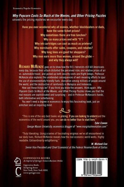 "Richard McKenzie takes the reader through the conundrums of pricing --why are there after-Christmas sales, why do new cars instantly lose so much value ... and how does subsidized university housing burden the university in unforeseen ways. And, of course, why popcorn costs so much at the movies. Fun but also illuminating on the power of markets to value your time and the products and services you purchase. Why Popcorn Costs So Much At the Movies, And Other Pricing Puzzles makes pricing theory interesting!" (Hugh Hewitt, June, 2008)