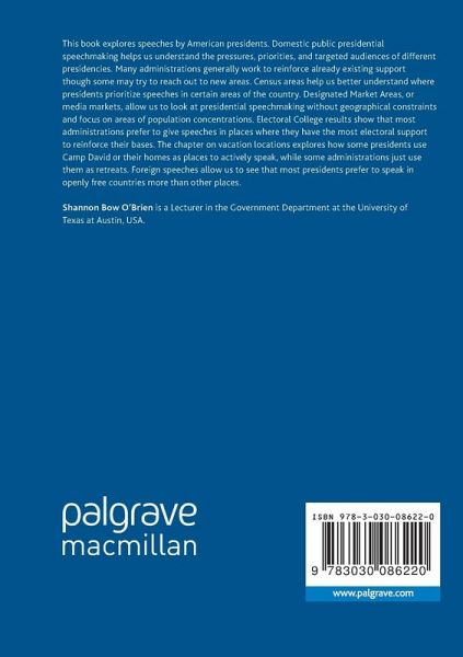 This book explores speeches by American presidents. Domestic public presidential speechmaking helps us understand the pressures, priorities, and targeted audiences of different presidencies. Many administrations generally work to reinforce already existing support though some may try to reach out to new areas. Census areas help us better understand where presidents prioritize speeches in certain areas of the country. Designated Market Areas, or media markets, allow us to look at presidential speechmaking without geographical constraints and focus on areas of population concentrations. Electoral College results show that most administrations prefer to give speeches in places where they have the most electoral support to reinforce their bases. The chapter on vacation locations explores how some presidents use Camp David or their homes as places to actively speak, while some administrations just use them as retreats. Foreign speeches allow us to see that most presidents prefer to speak in openly free countries more than other places.