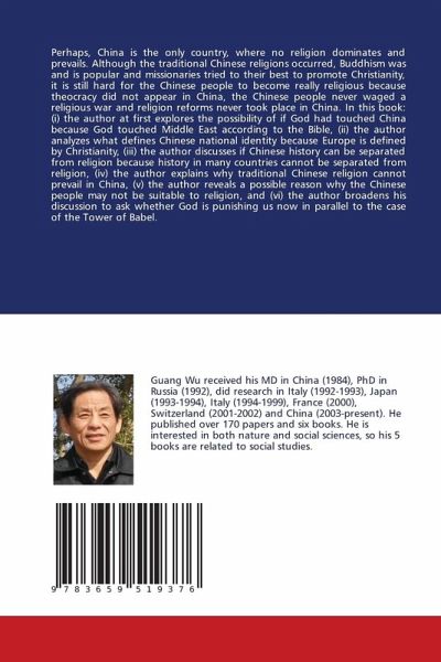 Perhaps, China is the only country, where no religion dominates and prevails. Although the traditional Chinese religions occurred, Buddhism was and is popular and missionaries tried to their best to promote Christianity, it is still hard for the Chinese people to become really religious because theocracy did not appear in China, the Chinese people never waged a religious war and religion reforms never took place in China. In this book: (i) the author at first explores the possibility of if God had touched China because God touched Middle East according to the Bible, (ii) the author analyzes what defines Chinese national identity because Europe is defined by Christianity, (iii) the author discusses if Chinese history can be separated from religion because history in many countries cannot be separated from religion, (iv) the author explains why traditional Chinese religion cannot prevail in China, (v) the author reveals a possible reason why the Chinese people may not be suitable to religion, and (vi) the author broadens his discussion to ask whether God is punishing us now in parallel to the case of the Tower of Babel.