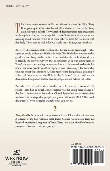 This is one man's journey to discover the truth about the Bible. Terry Read grew up in a Christian household and went to church. But Terry did not live in a bubble. Terry watched documentaries, read magazines, read encyclopedias, and went to public school. Terry knew that what he was learning about "science" from all of these other sources did not mesh with the Bible. Terry tried to make the two world views fit together somehow. But Terry discovered another option that he had never been taught-that a person could believe the Bible as it reads. The Bible does not contradict good science. Terry studied this. He learned that the biblical world view is actually the only world view that is consistent with even doing science. Terry's discovery was such great news to him that he wanted to share it. He knew that other people would be happy to hear this message. He knew that whether or not they admitted it, other people were doing mental gymnastics as he had done to make the Bible fit the "science." Terry could see the devastation brought on society because people do not believe the Bible. But when Terry tried to share his discovery, he became frustrated. The reason Terry had so much consternation was the unexpected source of the frustration-church leadership. Church leadership was actually afraid to share this message that people really can believe the Bible! This book document's Terry's struggles and tells what you can do.