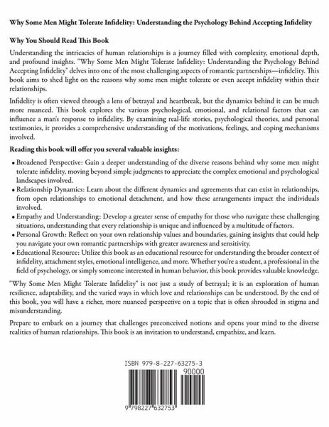 Why Some Men Might Tolerate Infidelity: Understanding the Psychology Behind Accepting Infidelity Why You Should Read This Book Understanding the intricacies of human relationships is a journey filled with complexity, emotional depth, and profound insights. "Why Some Men Might Tolerate Infidelity: Understanding the Psychology Behind Accepting Infidelity" delves into one of the most challenging aspects of romantic partnerships-infidelity. This book aims to shed light on the reasons why some men might tolerate or even accept infidelity within their relationships. Infidelity is often viewed through a lens of betrayal and heartbreak, but the dynamics behind it can be much more nuanced. This book explores the various psychological, emotional, and relational factors that can influence a man's response to infidelity. By examining real-life stories, psychological theories, and personal testimonies, it provides a comprehensive understanding of the motivations, feelings, and coping mechanisms involved. Reading this book will offer you several valuable insights:Broadened Perspective: Gain a deeper understanding of the diverse reasons behind why some men might tolerate infidelity, moving beyond simple judgments to appreciate the complex emotional and psychological landscapes involved. Relationship Dynamics: Learn about the different dynamics and agreements that can exist in relationships, from open relationships to emotional detachment, and how these arrangements impact the individuals involved. Empathy and Understanding: Develop a greater sense of empathy for those who navigate these challenging situations, understanding that every relationship is unique and influenced by a multitude of factors. Personal Growth: Reflect on your own relationship values and boundaries, gaining insights that could help you navigate your own romantic partnerships with greater awareness and sensitivity. Educational Resource: Utilize this book as an educational resource for understanding the broader context of infidelity, attachment styles, emotional intelligence, and more. Whether you're a student, a professional in the field of psychology, or simply someone interested in human behavior, this book provides valuable knowledge. "Why Some Men Might Tolerate Infidelity" is not just a study of betrayal; it is an exploration of human resilience, adaptability, and the varied ways in which love and relationships can be understood. By the end of this book, you will have a richer, more nuanced perspective on a topic that is often shrouded in stigma and misunderstanding. Prepare to embark on a journey that challenges preconceived notions and opens your mind to the diverse realities of human relationships. This book is an invitation to understand, empathize, and learn.