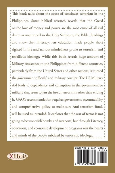 This book talks about the cause of continues terrorism in the Philippines. Some biblical research reveals that the Greed or the love of money and power are the root cause of all evil desire as mentioned in the Holy Scripture, the Bible. Findings also show that Illiteracy, less education made people short sighted in life and narrow mindedness prone to terrorism and rebellious ideology. While this book reveals huge amount of Military Assistance to the Philippines from different countries, particularly from the United States and other nations, it turned the government officials’ and military corrupt. The US Military Aid leads to dependence and corruption in the government or military that seem to fan the fire of terrorism rather than ending it. GAO’s recommendation requires government accountability and comprehensive policy to make sure Anti-terrorism funds will be used as intended. It explores that the war of terror is not going to be won with bombs and weapons, but through Literacy, education, and economic development programs win the hearts and minds of the people subdued by terroristic ideology.