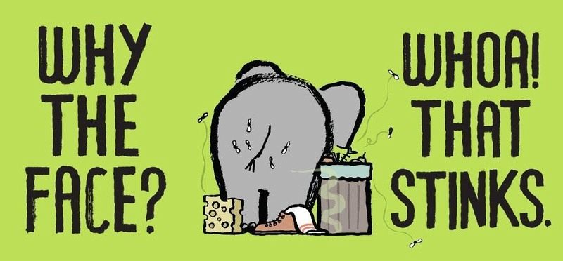 Jean Jullien tickles the funnybone once again with a book of facial overreactions. Faces are presented first, allowing the reader to wager predictions of what may have prompted such an expression, before the dramatic answer is revealed. Why the face? reads the text alongside an agitated boy with eyes and nose scrunched up. Pick up the full-page flap to reveal a whole mess of smelly items, from stinky socks to an oozing trash can, and the text, Whoa, that stinks. Jullien masterfully provides enough clues for the reader to piece together the narrative, including both predictable and surprising scenarios. Based on young children's natural fascination with faces, this book encourages readers to practice empathy and build emotional intelligence, with cleverly simplified and humorously satisfying vignettes. A brilliant addition to Phaidon's growing Jean Jullien board book library.