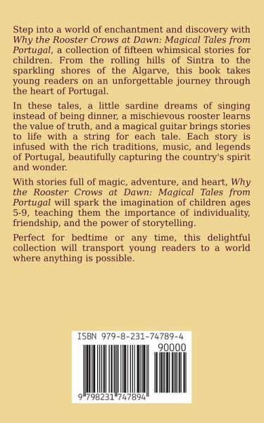 Step into a world of enchantment and discovery with Why the Rooster Crows at Dawn: Magical Tales from Portugal, a collection of fifteen whimsical stories for children. From the rolling hills of Sintra to the sparkling shores of the Algarve, this book takes young readers on an unforgettable journey through the heart of Portugal. In these tales, a little sardine dreams of singing instead of being dinner, a mischievous rooster learns the value of truth, and a magical guitar brings stories to life with a string for each tale. Each story is infused with the rich traditions, music, and legends of Portugal, beautifully capturing the country's spirit and wonder. With stories full of magic, adventure, and heart, Why the Rooster Crows at Dawn: Magical Tales from Portugal will spark the imagination of children ages 5-9, teaching them the importance of individuality, friendship, and the power of storytelling. Perfect for bedtime or any time, this delightful collection will transport young readers to a world where anything is possible.