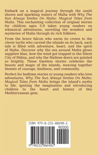 Embark on a magical journey through the sunlit shores and sparkling waters of Malta with Why The Sun Always Smiles On Malta: Magical Tales from Malta. This enchanting collection of original sixteen stories for children ages 5-9 takes young readers on whimsical adventures, unveiling the wonders and mysteries of Malta through its rich folklore. From the brave falcon who earns its crown to the clever turtle who carried the islands on its back, each tale is filled with adventure, heart, and the spirit of Malta. Discover why the sea around Malta glows sapphire blue, how the wind got trapped in the Silent City of Mdina, and why the Maltese doors are painted so brightly. These timeless stories celebrate the beauty and magic of the islands, weaving together themes of courage, kindness, and community. Perfect for bedtime stories or young readers who love adventures, Why The Sun Always Smiles On Malta: Magical Tales from Malta brings the island's myths to life, igniting the imagination and introducing children to the heart and history of this Mediterranean gem.