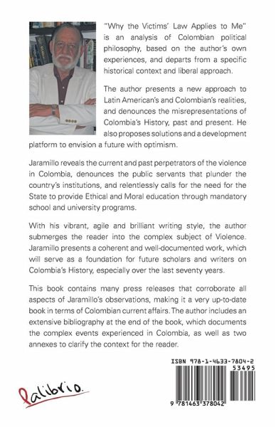 "Why the Victims' Law Applies to Me" is an analysis of Colombian political philosophy, based on the author's own experiences, and departs from a specific historical context and liberal approach. The author presents a new approach to Latin American's and Colombian's realities, and denounces the misrepresentations of Colombia's History, past and present. He also proposes solutions and a development platform to envision a future with optimism. Jaramillo reveals the current and past perpetrators of the violence in Colombia, denounces the public servants that plunder the country's institutions, and relentlessly calls for the need for the State to provide Ethical and Moral education through mandatory school and university programs. With his vibrant, agile and brilliant writing style, the author submerges the reader into the complex subject of Violence. Jaramillo presents a coherent and well-documented work, which will serve as a foundation for future scholars and writers on Colombia's History, especially over the last seventy years. This book contains many press releases that corroborate all aspects of Jaramillo's observations, making it a very up-to-date book in terms of Colombian current affairs. The author includes an extensive bibliography at the end of the book, which documents the complex events experienced in Colombia, as well as two annexes to clarify the context for the reader.