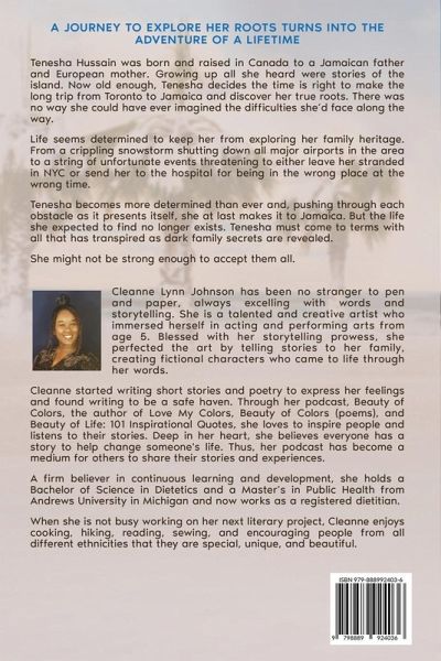 A journey to explore her roots turns into the adventure of a lifetime. Tenesha Hussain was born and raised in Canada to a Jamaican father and European mother. Growing up all she heard were stories of the island. Now old enough, Tenesha decides the time is right to make the long trip from Toronto to Jamaica and discover her true roots. There was no way she could have ever imagined the difficulties she'd face along the way. Life seems determined to keep her from exploring her family heritage. From a crippling snowstorm shutting down all major airports in the area to a string of unfortunate events threatening to either leave her stranded in NYC or send her to the hospital for being in the wrong place at the wrong time. Tenesha becomes more determined than ever and, pushing through each obstacle as it presents itself, she at last makes it to Jamaica. But the life she expected to find no longer exists. Tenesha must come to terms with all that has transpired as dark family secrets are revealed. She might not be strong enough to accept them all.