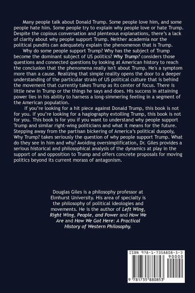 Why do some people support Trump? Why has the subject of Trump become the dominant subject of US politics? Why Trump? considers those questions and connected questions by exploring American history to show that the MAGA movement really isn't about Trump. Trump is a symptom far more than he is a cause. Realizing that simple reality opens the door to a deeper understanding of the particular strain of US political culture behind the movement that currently takes Trump as its focus. There is little new in Trump or the things he says and does. His success in attaining power lies in his ability to harness a long-simmering feeling in a segment of the American population. If you're looking for a diatribe against Donald Trump, this book is not for you. If you're looking for a hagiography extolling Trump, this book is not for you. This book is for you if you want to understand why people support Trump and similar right-wing politicians and what it means for the future. Stepping away from the partisan bickering of America's political duopoly, Why Trump? takes seriously the question of why people support Trump. What do these people see in Trump and why? Avoiding oversimplification, Dr. Giles provides a serious historical and philosophical analysis of the dynamics at play in the support of and opposition to Trump and offers concrete proposals for moving politics beyond its current morass of antagonism.