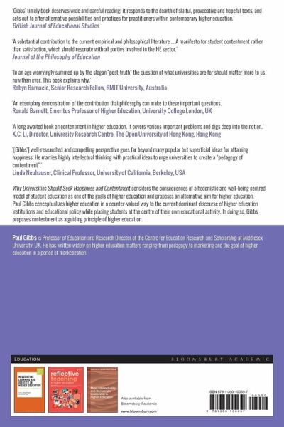 The totalising effect of consumerism, well-being and satisfaction is a discourse which may negate the value of struggle and mastery of complex subjects and a realization of personal potentiality. Published open access, Why Universities Should Seek Happiness and Contentment considers the consequences of a hedonistic and well-being centred model of student education as one of the goals of higher education and proposes an alternative goal for higher education. In a globalised consumer society where the anxiety for an identity leads to the fear of not reaching the standard, Paul Gibbs shows how anxiety can be harnessed to secure contentment with one's own future without the fear of consumer-induced emptiness. He conceptualises higher education in a counter-valued way to the current dominant discourse of higher education institutions and educational policy while placing students at the centre of their own educational activity. In doing so, Gibbs proposes contentment as a guiding principle of higher education. The ebook editions of this book are available open access under a CC BY-NC-ND 4.0 licence on bloomsburycollections.com. Open access was funded by Knowledge Unlatched.