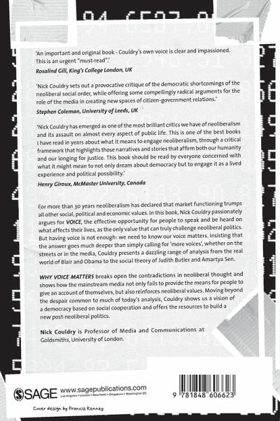 For more than thirty years neoliberalism has declared that market functioning trumps all other social, political and economic values. In this book, Nick Couldry passionately argues for voice, the effective opportunity for people to speak and be heard on what affects their lives, as the only value that can truly challenge neoliberal politics. But having voice is not enough: we need to know our voice matters. Insisting that the answer goes much deeper than simply calling for 'more voices', whether on the streets or in the media, Couldry presents a dazzling range of analysis from the real world of Blair and Obama to the social theory of Judith Butler and Amartya Sen.