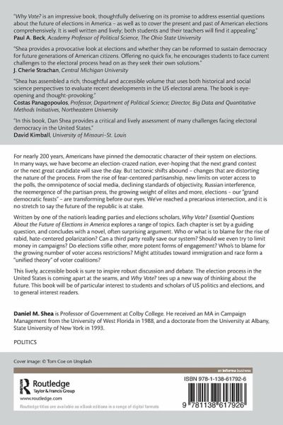 For nearly 200 years, Americans have pinned the democratic character of their system on elections. In many ways, we have become an election-crazed nation, ever-hoping that the next grand contest or the next great candidate will save the day. But tectonic shifts abound - changes that are distorting the nature of the process. From the rise of fear-centered partisanship, new limits on voter access to the polls, the omnipotence of social media, declining standards of objectivity, Russian interference, the reemergence of the partisan press, the growing weight of elites and more, elections - our "grand democratic feasts" - are transforming before our eyes. We've reached a precarious intersection, and it is no stretch to say the future of the republic is at stake. Written by one of the nation's leading parties and elections scholars, Why Vote? Essential Questions About the Future of Elections in America explores a range of topics. Each chapter is set by a guiding question, and concludes with a novel, often surprising argument. Who or what is to blame for the rise of rabid, hate-centered polarization? Can a third party really save our system? Should we even try to limit money in campaigns? Do elections stifle other, more potent forms of engagement? Who's to blame for the growing number of voter access restrictions? Might attitudes toward immigration and race form a "unified theory" of voter coalitions? This lively, accessible book is sure to inspire robust discussion and debate. The election process in the United States is coming apart at the seams, and Why Vote? tees up a new way of thinking about the future. This book will be of particular interest to students and scholars of US politics and elections, and to general interest readers.
