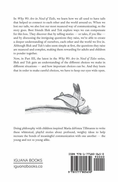 In Why We Are in Need of Tails, we learn how we all used to have tails that helped us connect to each other and the world around us. When we lost our tails, we also lost our most nuanced way of communicating, so the story goes. Best friends Huk and Tuk explore ways we can compensate for this loss. They discover that by telling stories - or tales, if you like - and by discussing the intriguing questions they raise, we're able to create a deeper understanding of ourselves, each other and the world we live in. Although Huk and Tuk's tales seem simple at first, the questions they raise are nuanced and complex, making them rewarding for adults and children to ponder together. Now, in Part III, the latest in the Why We Are in Need of Tales series, Huk and Tuk gain an understanding of the different choices we make in different situations - and how important choices can be. And they learn that in order to make careful choices, we have to keep our eyes wide open. Doing philosophy with children inspired Maria daVenza Tillmanns to write these whimsical, playful stories about profound, weighty ideas to help recreate the bonds of meaningful communication with one another - the young and not so young alike.