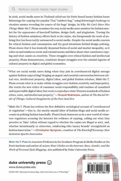 In 2016, social media users in Thailand called out the Paris-based luxury fashion house Balenciaga for copying the popular Thai "rainbow bag," using Balenciaga's hashtags to circulate memes revealing the source of the bags' design. In Why We Can't Have Nice Things Minh-Ha T. Pham examines the way social media users monitor the fashion market for the appearance of knockoff fashion, design theft, and plagiarism. Tracing the history of fashion antipiracy efforts back to the 1930s, she foregrounds the work of policing that has been tacitly outsourced to social media. Despite the social media concern for ethical fashion and consumption and the good intentions behind design policing, Pham shows that it has ironically deepened forms of social and market inequality, as it relies on and reinforces racist and colonial norms and ideas about what constitutes copying and what counts as creativity. These struggles over ethical fashion and intellectual property, Pham demonstrates, constitute deeper struggles over the colonial legacies of cultural property in digital and global economies.
