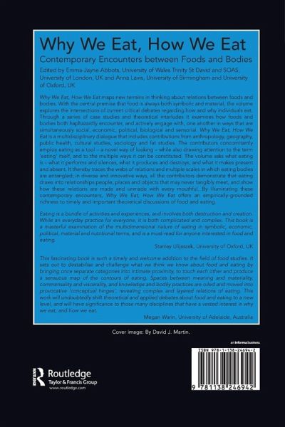 Why We Eat, How We Eat maps new terrains in thinking about relations between bodies and foods. With the central premise that food is both symbolic and material, the volume explores the intersections of current critical debates regarding how individuals eat and why they eat. Through a wide-ranging series of case studies it examines how foods and bodies both haphazardly encounter, and actively engage with, one another in ways that are simultaneously material, social, and political. The aim and uniqueness of this volume is therefore the creation of a multidisciplinary dialogue through which to produce new understandings of these encounters that may be invisible to more established paradigms. In so doing, Why We Eat, How We Eat concomitantly employs eating as a tool - a novel way of looking - while also drawing attention to the term 'eating' itself, and to the multiple ways in which it can be constituted. The volume asks what eating is - what it performs and silences, what it produces and destroys, and what it makes present and absent. It thereby traces the webs of relations and multiple scales in which eating bodies are entangled; in diverse and innovative ways, contributors demonstrate that eating draws into relationships people, places and objects that may never tangibly meet, and show how these relations are made and unmade with every mouthful. By illuminating these contemporary encounters, Why We Eat, How We Eat offers an empirically grounded richness that extends previous approaches to foods and bodies.
