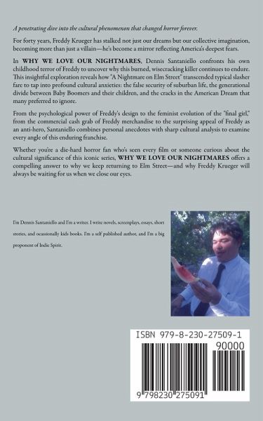 A penetrating dive into the cultural phenomenon that changed horror forever. For forty years, Freddy Krueger has stalked not just our dreams but our collective imagination, becoming more than just a villain-he's become a mirror reflecting America's deepest fears. In WHY WE LOVE OUR NIGHTMARES, Dennis Santaniello confronts his own childhood terror of Freddy to uncover why this burned, wisecracking killer continues to endure. This insightful exploration reveals how "A Nightmare on Elm Street" transcended typical slasher fare to tap into profound cultural anxieties: the false security of suburban life, the generational divide between Baby Boomers and their children, and the cracks in the American Dream that many preferred to ignore. From the psychological power of Freddy's design to the feminist evolution of the "final girl," from the commercial cash grab of Freddy merchandise to the surprising appeal of Freddy as an anti-hero, Santaniello combines personal anecdotes with sharp cultural analysis to examine every angle of this enduring franchise. Whether you're a die-hard horror fan who's seen every film or someone curious about the cultural significance of this iconic series, WHY WE LOVE OUR NIGHTMARES offers a compelling answer to why we keep returning to Elm Street-and why Freddy Krueger will always be waiting for us when we close our eyes.