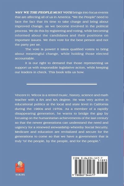 "Why We the People Must Vote" brings into focus events that are affecting all of us in America. "We the People" need to face the fact that it's time to take charge and bring about improved change, as we become involved in the political process. We do this by registering and voting, while becoming informed about the candidates and their positions on important issues. We then vote for the best person and not the party per se. The vote is power! It takes qualified voters to bring about meaningful change, while holding those elected accountable. It is our right to demand that those representing us support us with responsible legislative action, while keeping our leaders in check. This book tells us how. VINCENT H. WILCOX is a retired music, history, science and math teacher with a BA and MA degree. He was very active in educational politics at the local and state level in California during the 1960s and 1970s. As a member of a rapidly disappearing generation, he wants to bridge the gap by focusing on the humanitarian achievements of the last century so that the newer generations can understand the need and urgency for a renewed stewardship whereby Social Security, Medicare and education are revitalized and secure for the generations to come so that we have a government that is truly "of the people, by the people, and for the people.".