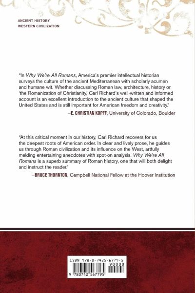 This engaging yet deeply informed work not only examines Roman history and the multitude of Roman achievements in rich and colorful detail but also delineates their crucial and lasting impact on Western civilization. Noted historian Carl J. Richard argues that although we Westerners are "all Greeks" in politics, science, philosophy, and literature and "all Hebrews" in morality and spirituality, it was the Romans who made us Greeks and Hebrews. As the author convincingly shows, from the Middle Ages on, most Westerners received Greek ideas from Roman sources. Similarly, when the Western world adopted the ethical monotheism of the Hebrews, it did so at the instigation of a Roman citizen named Paul, who took advantage of the peace, unity, stability, and roads of the empire to proselytize the previously pagan Gentiles, who quickly became a majority of the religion's adherents. Although the Roman government of the first century crucified Christ and persecuted Christians, Rome's fourth- and fifth-century leaders encouraged the spread of Christianity throughout the Western world. In addition to making original contributions to administration, law, engineering, and architecture, the Romans modified and often improved the ideas they assimilated. Without the Roman sense of social responsibility to temper the individualism of Hellenistic Greece, classical culture might have perished, and without the Roman masses to proselytize and the social and material conditions necessary to this evangelism, Christianity itself might not have survived.