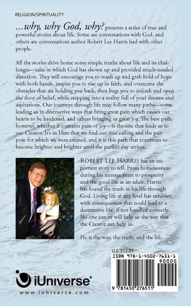 ...why, why God, why? presents a series of true and powerful stories about life. Some are conversations with God, and others are conversations author Robert Lee Harris had with other people. All the stories drive home some simple truths about life and its challenges-tales in which God has shown up and provided much-needed direction. Our journeys through life may follow many paths-some leading us in destructive ways that bring great pain and cause our hearts to be hardened, and others bringing us to great joy. The best path, however-whether it contains pain or joy-is the one that leads us to our Creator. It's in Him that we find our true calling and the purpose for which we were created, and it iss this path that continues to become brighter and brighter until the perfect day arrives. Robert Lee Harris has an important story to tell. From homelessness during his teenage years to prosperity and the good life as an adult, Harris has found the truth in his life through God. Living life at any level has troubles, with consequences that could lead to a destructive life, if not handled correctly. No one can or will help us the way that the Creator can help us. He is the way, the truth, and the life.