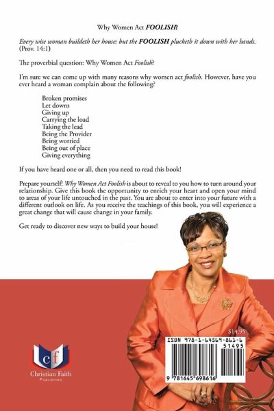 Why Women Act FOOLISH? Every wise woman buildeth her house: but the FOOLISH plucketh it down with her hands. (Prov. 14:1) The proverbial question: Why Women Act Foolish? I'm sure we can come up with many reasons why women act foolish. However, have you ever heard a woman complain about the following? Broken promises Let downs Giving up Carrying the load Taking the lead Being the Provider Being worried Being out of place Giving everything If you have heard one or all, then you need to read this book! Prepare yourself! Why Women Act Foolish is about to reveal to you how to turn around your relationship. Give this book the opportunity to enrich your heart and open your mind to areas of your life untouched in the past. You are about to enter into your future with a different outlook on life. As you receive the teachings of this book, you will experience a great change that will cause change in your family. Get ready to discover new ways to build your house!