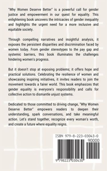 "Why Women Deserve More" is an inspiring book that emphasizes the importance of gender equality and explains why it is not just a matter of justice but also a driving force for a better society. In a accessible manner, the author presents arguments and evidence for why women deserve better conditions and treatment in all aspects of life. Weaving together thorough analysis with personal stories and experiences, the book showcases a wide range of challenges women face on a daily basis, from wage inequality and workplace discrimination to violence and restrictions on making decisions about their bodies and lives. However, this is not just a book about problems; it is also about solutions. The author introduces various initiatives aimed at achieving full gender equality, along with examples of individuals and organizations that inspire change and take concrete actions. The book provides practical guidance on how everyone can contribute to the fight for gender equality in their own surroundings. "Why Women Deserve More" is also a call for greater social solidarity and the engagement of all individuals, regardless of gender, in the pursuit of justice and equality. It demonstrates that through collective action and mutual support, we can create a better future where women have equal opportunities for development, self-fulfillment, and full participation in all areas of life. This wise, poignant, and timely book is dedicated to all who wish to understand and contribute to changing gender inequalities. If you are ready for a deeper understanding of the issue and are seeking solutions, "Why Women Deserve More" will be an inspiring guide that helps you engage in the fight for justice and gender equality.