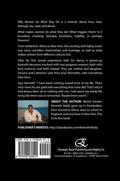 Why Women Do What They Do is a memoir about love, hate, betrayal, sex, rape, and abuse. What makes women do what they do? What triggers them? Is it boredom, cheating, betrayal, loneliness, stability, or perhaps finances? From Holland to Africa to New York, this exciting and highly erotic true story considers relationships and marriage, as well as what makes women from different cultures tick. After his first sexual experience with his nanny, a grown-up Kenneth becomes involved with two gorgeous women, both with feral instincts, and both related. They are mother and daughter. Simone and Catherine seek their prey (Kenneth), with everything they have. Says Kenneth, "I have been running scared most of my life. That's why I went for the gold with everything that I ever did. That's why it had always been all or nothing with me. I had spent my whole life living like there was no tomorrow. Maybe there wasn't." About the Author: World traveler Kenneth Madu grew up in Amsterdam, then moved to Africa, went to school in England, and now lives in New York. This is his first book. Publisher's website: http://sbprabooks.com/KennethMadu