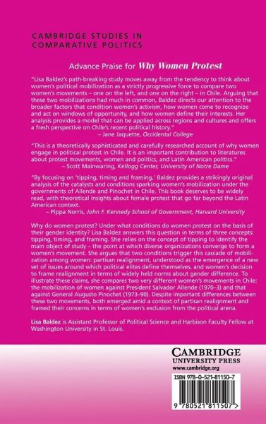 Why do women protest? Under what conditions do women protest on the basis of their gender identity? Professor Baldez answers in terms of tipping, timing and framing. She relies on the concept of tipping to identify the point at which diverse organizations converge to form a women's movement. She argues that two conditions trigger this mobilization among women: partisan realignment, understood as the emergence of a new set of issues around which political elites define themselves, and women's decision to frame realignment in terms of widely held norms about gender difference. To illustrate these claims, she compares two very different women's movements in Chile: the mobilization of women against President Salvador Allende (1970-3) and that against General Augusto Pinochet (1973-90). Despite differences between these two movements, both emerged amidst a context of partisan realignment and framed their concerns in terms of women's exclusion from the political arena.
