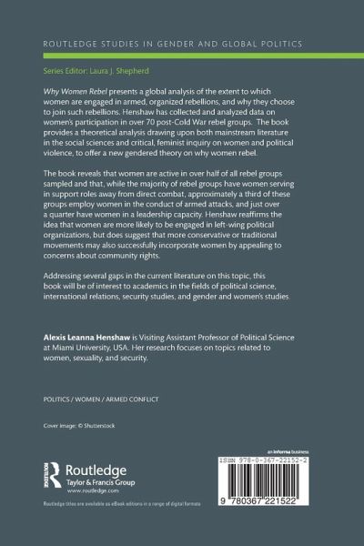 Why Women Rebel presents a global analysis of the extent to which women are engaged in armed, organized rebellions, and why they choose to join such rebellions. Henshaw has collected and analyzed data on women's participation in over 70 post-Cold War rebel groups. The book provides a theoretical analysis drawing upon both mainstream literature in the social sciences and critical, feminist inquiry on women and political violence to offer a new gendered theory on why women rebel. The book reveals that women are active in over half of all rebel groups sampled and that, while the majority of rebel groups have women serving in support roles away from direct combat, approximately a third of these groups employ women in the conduct of armed attacks, and just over a quarter have women in a leadership capacity. Henshaw reaffirms the idea that women are more likely to be engaged in left-wing political organizations, but does suggest that more conservative or traditional movements may also successfully incorporate women by appealing to concerns about community rights. Addressing several gaps in the current literature on this topic, this book will be of interest to academics in the fields of political science, international relations, security studies, and gender and women's studies.
