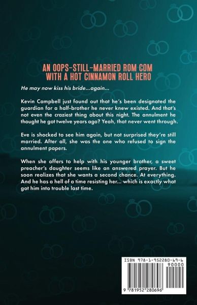 An oops-still-married rom com with a hot cinnamon roll hero He may now kiss his bride...again... Kevin Campbell just found out that he's been designated the guardian for a half-brother he never knew existed. And that's not even the craziest thing about this night. The annulment he thought he got twelve years ago? Yeah, that never went through. Eve is shocked to see him again, but not surprised they're still married. After all, she was the one who refused to sign the annulment papers. When she offers to help with his younger brother, a sweet preacher's daughter seems like an answered prayer. But he soon realizes that she wants a second chance. At everything. And he has a hell of a time resisting her... which is exactly what got him into trouble last time.