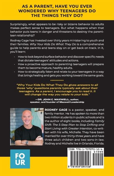 As a parent, have you ever wondered why teenagers do the things they do? Surprisingly, what appears to be risky or bizarre behavior to adults makes perfect sense to teenagers. But what happens when that behavior puts teens in danger and threatens to destroy the parent-teen relationship? Rodney Gage has invested over thirty years ministering to youth and their families. Why Your Kids Do What They Do is a comprehensive guide to help parents and teens stay on or get back on track. In it, you'll learn:How to look beyond surface behavior and discover specific needs that dictate teenagers' attitudes and actions. How a proactive approach to parenting teenagers will prepare them to become mature, healthy adults. How to strategically listen and relate to your teenagers in a way that brings healing and gets you working toward the same goals. "Why Your Kids Do What They Do gives answers to all those 'why' questions parents typically ask about their teenagers. As a parent, I encourage you to read it. It will change the way you relate to your kids." -Dr. John C. Maxwell, author, speaker, and founder of Maxwell Leadership