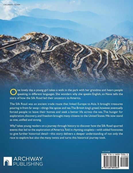 One lovely day, a young girl takes a walk in the park with her grandma and hears people speaking in different languages. She wonders why she speaks English, so Nana tells the story of how the Silk Road led their ancestors to America. The Silk Road was an ancient trade route that linked Europe to Asia. It brought treasures pouring in from far away-things like spices and tea. The British king's greed, however, eventually forced people to leave their homes and seek a better life across the sea. The hunger for exploration, discovery, and freedom brought many citizens to the United States. We now stand as one, unified and strong. Why? takes young readers on a journey through history to discover how the Silk Road spurred events that led to the exploration of America. Told in rhyming couplets-with added footnotes to give further historical detail-this story delivers a deeper understanding of not only the race to explore but also the many twists and turns this historical journey took.