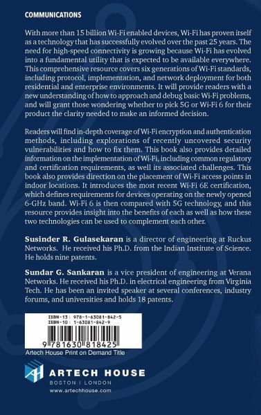 "With more than 15 billion Wi-Fi enabled devices, Wi-Fi has proven itself as a technology that has successfully evolved over the past 25 years. The need for high-speed connectivity is growing, as Wi-Fi has evolved into a fundamental utility that is expected to be available everywhere. This comprehensive resource covers six generations of Wi-Fi standards including protocol, implementation, and network deployment for both residential and enterprise environments. It will provide readers with a new understanding of how to approach and debug basic Wi-Fi problems, and will grant those wondering whether to pick 5G or Wi-Fi 6 for their product the clarity needed to make an informed decision. Readers will find in-depth coverage of Wi-Fi encryption and authentication methods, including explorations of recently uncovered security vulnerabilities and how to fix them. This book also provides detailed information on the implementation of Wi-Fi, including common regulatory and certification requirements, as well its associated challenges. This book also provides direction on the placement of Wi-Fi access points in indoor locations. It introduces the most recent Wi-Fi 6E certification, which defines requirements for devices operating on the newly opened 6 GHz band. Wi-Fi 6 is then compared with 5G technology, and this resource provides insight into the benefits of each as well as how these two technologies can be used to complement each other." --