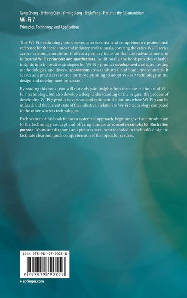 This Wi-Fi 7 technology book serves as an essential and comprehensive professional reference for the academics and industry professionals, covering the entire Wi-Fi series across various generations. It offers a primary focus on the latest advancements in industrial Wi-Fi 7 principles and specifications. Additionally, the book provides valuable insights into innovative strategies for Wi-Fi 7 product development strategies, testing methodologies, and diverse applications across industrial and home environments. It serves as a practical resource for those planning to adopt Wi-Fi 7 technology in the design and development processes.