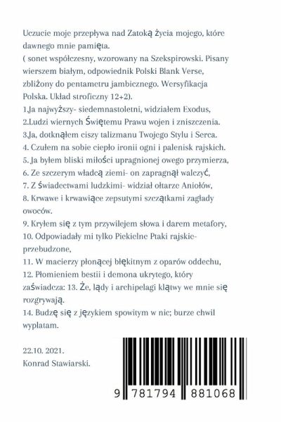 Konrad Stawiarski /biogram/ Urodzi¿em si¿ 5 maja 1983 roku. Debiut w roku 2013 w ¿wi¿tokrzyskim Kwartalniku literackim wydwnictwa STONE2, którego Pe¿nomocnikiem jest Prezes Zwi¿zków Literatów Polskich Oddziä Kiece Stanis¿aw Nyczaj. W latach 2013, 2014, 2015 zdoby¿em nagrody pierwsze ¿wietokrzyskiej Wiosny Literackiej Zagnäk 2013. W sk¿ad komisji wchodzili; Stanis¿aw Nyczaj, Andrzej Piskulak, Krystyna Cel. W roku 2014 zdoby¿em nagrod¿ literack¿ w I OGÓLNOPOLSKIM KONKURSIE POETYCKIM IM. JULIANA TUWIMA W INOW¿ÓDZ 25 STYCZNIA 2014 ROKU. Publikuj¿ swoje utwory w grupach literacko- poetyckich takich jak Ksztäty S¿ów, gdzie w roku 2017- 2018 by¿em Administratorem, Symfonia Poetow, Pisarzy i Artystów gdzie jestem Administratorem na której to stronie powstaje opus wielotomowy Boski Chór. Boski Dramat w dalszych tomach znany jako NUVONALIS, Jestem wspó¿twórc¿ Boskiego Chóru, Boskiego Dramatu obok Katarzyny Dominik, Tadeusza Hutyry. W tomach Nuvonalis, tytü mojego pomys¿u, moim wk¿adem s¿ ok¿adki do tomów, w których wykonywäem opisy, a wykonawc¿ projektu jest Jerzy Granowski. Ok¿adki jak i tytüu poszczególnych tytüów s¿ mojego autorstwa, i wraz z Tadeuszem Hutyr¿ opracowujemy do tomów Nuvonalis motta. Tytü ENEIDRION jest mjego pomys¿u, dziäy i podtytüy mojego autorstwa, Tadeusza wk¿ad üöenie ksi¿¿ki. Jestem w grupach takich jak: S¿owa Zamkniete w Wersch, Peron Literacki, Müni¿cie Motyla, Klub Poetów Niepokornych, Poeci Wspó¿cze¿ni, Podteskt Kulturalny. Pisanie jest dla mnie pasj¿, hobby. Uczestniczy¿em w Targach Ksi¿¿ki w Warszawie w 2017 roku promuj¿c Boski Chór, Boski Dramat wraz z YVETTE POPLAWSKA. Konkurs: POKOLENIA M w 2017 gdzie zdoby¿em miejsce III i nagrod¿. Zdoby¿em równie¿ nagrod¿ w konkursie "Czy to gwar¿, czy polszczyzn¿, nasza mowa jest ojczyst¿" w Domu Polonijnym we Wroc¿awiu, pod przewodnictwem prof. Jana Miodka i patronatem Mi¿dzynarodowego Stowarzyszenia Artystów Autorów Dziennikarzy Prawników Virtualia Art., 24.08.2018 roku. 5-go pädziernika 2019 roku wzi¿¿em udziä w wyst¿pie w legendarnej Piwnicy pod Baranami w Krakowie, którego by¿ wspó¿organizatorem razem z Yvette Pop¿awsk¿ i Tadeuszem Hutyra. Moje wiersze s¿ równie¿ opublikowane w ¿wiatowym journalu Spillwords.