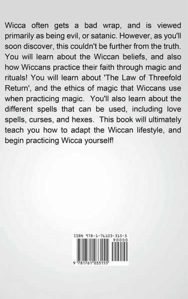 WICCA FOR BEGINNERS You're about to discover all about Wicca, Wiccan beliefs, magic, rituals, Wicca history, and more! Wicca often gets a bad wrap, and is viewed primarily as being evil, or satanic. However, as you'll soon discover, this couldn't be further from the truth. You will learn about the Wiccan beliefs, and also how Wiccans practice their faith through magic and rituals! You will learn about 'The Law of Threefold Return', and the ethics of magic that Wiccans use when practicing magic. You'll also learn about the different spells that can be used, including love spells, curses, and hexes. This book will teach you how to adapt the Wiccan lifestyle, and begin practicing Wicca yourself. This includes how to make your own book of shadows, how to create and cast spells, and also how to perform Wiccan rituals. Here Is What You'll Learn About... Wiccan History and Beliefs The Law of Threefold Return Wiccan Ethics Curses, Hexes, and Love Spells How to Create a Book of Shadows Wiccan Rituals How to Cast a Spell Much, Much More!