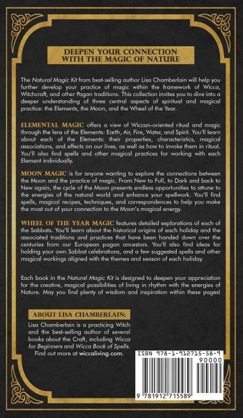 Everything You Need to Know to Build Your Practice of the Craft Are you ready to take your magical experience to the next level? Wicca Natural Magic Kit from best-selling author Lisa Chamberlain will help you further develop your practice of magic within the framework of Wicca, Witchcraft, and other Pagan traditions. Expanding on core concepts found in Lisa's first book, Wicca for Beginners, the Natural Magic Kit is intended for new and more experienced Witches alike, inviting you to dive into a deeper understanding of three central aspects of spiritual and magical practice: the Elements, the Moon, and the Wheel of the Year. The "Old Religion" is all about revering Nature and tapping its infinite energies. Each book in the Natural Magic Kit contains spells, rituals, and other magical workings that will help you open up amazing pathways to a deeper connection with the Universe, and enhance your quality of life. Elemental Magic: A Guide to the Elements, Witchcraft, and Magic Elemental Magic offers a view of Wiccan-oriented ritual and magic through the lens of the Elements: Earth, Air, Fire, Water, and Spirit. Lisa introduces you to each of the Elements: their properties, characteristics, magical associations, and effects on our lives. You'll learn how the Elements are invoked in ritual, as well as some techniques and magical practices for working with each Element individually. Of course, you'll also find spells, rituals and charms focused on each Element. Elemental Magic will be a treasured reference, magical guide, and springboard for you to make your own discoveries about the power of the Elements and the magic they have to offer. Moon Magic: A Wiccan's Guide and Grimoire for Working Magic with Lunar Energies Moon Magic is for anyone wanting to explore the connections between the Moon and the practice of magic. From New to Full, to Dark and back to New again, the never-ending cycle of the Moon presents wonderful opportunities to tune in to the energies of the natural world and enhance your spellwork. Lisa touches on specific elements of Wiccan practice, like the Moon and the Triple Goddess, the celebration of Esbats, and the sacred act of drawing down the Moon, yet the larger focus is on the power of the Moon itself and the benefits of an approach to magic that is aligned with its cycles. To that end, you'll find a detailed breakdown of each phase of the lunar cycle, spells for each phase, and magical recipes, techniques, and correspondences-all focused on making the most out of your connection to the Moon's magical energy. Wheel of the Year Magic: A Beginner's Guide to the Sabbats, with History, Celebration Ideas, and Dedicated Sabbat Spells Wheel of the Year Magic is rooted in Wiccan practices, but much of it is applicable to Pagans of all stripes, as well as anyone who is simply curious about the rich traditions surrounding these milestones of the Old Religion. Lisa offers detailed explorations of each Sabbat, including their significance within the context of the changing seasons, the part they play in the mythological cycle of the Goddess and the God, and the spiritual themes they ask us to reflect upon as we celebrate them. You'll learn about the historical origins of each holiday and the associated traditions and practices that have been handed down over the centuries from our European pagan ancestors. And of course, you'll also find tips and ideas for holding your own Sabbat celebrations, plus a few suggested spells and other magical workings that correspond with the themes and season of each holiday. Each book in the Natural Magic Kit is designed to deepen your appreciation for the creative, magical possibilities of living in rhythm with the energies of Nature.