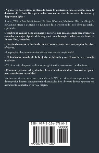 ¿Alguna vez has sentido un llamado hacia lo misterioso, una atracción hacia lo desconocido? ¿Estás listo para embarcarte en un viaje de autodescubrimiento y despertar mágico? Si es así, "Wicca Para Principiantes: Hechizos Wiccanos, Magia con Hierbas y Brujería: El Camino Hacia el Misterio y el Dominio de lo Desconocido" es el libro que estabas esperando. Descubre un camino lleno de magia y misterio, una guía diseñada para ayudarte a entender y manejar el poder de la magia wiccana, la magia con hierbas y la brujería. En este libro, aprenderás: ¿ Los fundamentos de los hechizos wiccanos y cómo crear tus propios hechizos efectivos. ¿ Las propiedades y usos de varias hierbas para realizar magia herbal. ¿ El fascinante mundo de la brujería, su historia y su relevancia en el mundo moderno. ¿ Técnicas y rituales para canalizar tu energía interior y conectarte con el universo. ¿ El camino para entender y dominar lo desconocido, dándote el control y el poder para transformar tu realidad. No importa si eres nuevo en el mundo de la Wicca o si ya tienes experiencia pero deseas profundizar tus conocimientos y habilidades. Este libro está diseñado para ser una herramienta invaluable en tu viaje mágico.