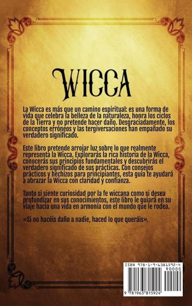 WICCA La Wicca es una maravillosa religión pagana que, en su forma más básica, trata de celebrar el mundo natural que habitamos. Sin embargo, como resultado de una desafortunada tergiversación, a veces puede tener connotaciones negativas. Este libro pretende aclarar las cosas y le explicará la historia de la religión wiccana, los principios básicos por los que se rigen los wiccanos y cómo puede empezar a practicar la fe wiccana. Incluso se incluyen algunos hechizos de muestra que puedes probar por ti mismo. Este libro te enseñará lo siguiente - La historia de la Wicca - Los principios básicos de la fe wiccana - Mitos y conceptos erróneos sobre la Wicca - La Rueda del Año - Las Herramientas Usadas para Practicar Wicca (Altar, Athame, Cáliz, Velas, etc.) - Hechizos para la Prosperidad - Hechizos para Bendecir un Espacio - Hechizos para el Dinero - ¡Mucho, Mucho Más! Por encima de todo, usted puede esperar salir de este libro con una clara comprensión de las creencias Wiccan y la magia Wiccan. ¡Desplácese hacia arriba y haga clic en Comprar ahora para descubrir el poder de la Wicca hoy! No dañéis a nadie, haced lo que queráis.