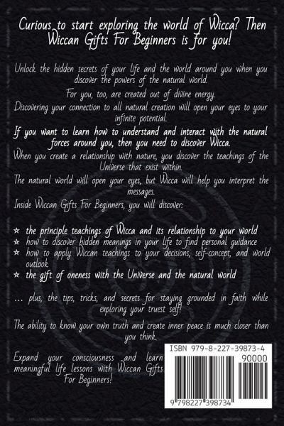 Curious to start exploring the world of Wicca? Then Wiccan Gifts For Beginners is for you! Unlock the hidden secrets of your life and the world around you when you discover the powers of the natural world. For you, too, are created out of divine energy. Discovering your connection to all-natural creation will open your eyes to your infinite potential. If you want to learn how to understand and interact with the natural forces around you, then you need to discover Wicca. When you create a relationship with nature, you discover the teachings of the Universe that exist within. The natural world will open your eyes, but Wicca will help you interpret the messages. Inside Wiccan Gifts For Beginners, you will discover: the principal teachings of Wicca and its relationship to your world how to discover hidden meanings in your life to find personal guidance how to apply Wiccan teachings to your decisions, self-concept, and world outlook the gift of oneness with the Universe and the natural world ... plus, the tips, tricks, and secrets for staying grounded in faith while exploring your truest self! The ability to know your own truth and create inner peace is much closer than you think. Expand your consciousness and learn meaningful life lessons with Wiccan Gifts For Beginners!