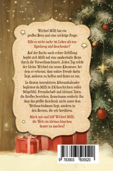 Der magische Mitmach-Adventskalender für KinderHilf Wichtel Milli auf seiner besonderen Mission: 24 bezaubernde Weihnachtsgeschichten und gute Taten warten auf dich!Mit diesem einzigartigen Mitmach-Adventskalender wird die Vorweihnachtszeit zu einem besonderen Erlebnis! In 24 liebevoll erzählten Geschichten begleitest du den neugierigen Wichtel Milli auf seiner Mission. Jeden Tag wartet eine neue Geschichte darauf, vorgelesen oder selbst gelesen zu werden.Tauche ein in die zauberhafte Welt von Wichtel Milli, der sich auf eine ganz besondere Reise begibt. Während andere Wichtel fleißig Spielzeuge für Weihnachten basteln, fragt sich Milli, ob es nicht wichtigere Dinge gibt als Geschenke. Er sucht nach echter Erfüllung und findet sie in den kleinen, aber bedeutungsvollen Taten, die das Herz erwärmen.Jede Geschichte endet mit einer guten Tat, die du direkt umsetzen kannst. Ob es darum geht, Vogelfutter auszustreuen, jemandem ein aufrichtiges Kompliment zu machen oder einfach freundlich zu sein - durch diese kleinen Gesten erfährst du, wie einfach es sein kann, das Leben anderer zu bereichern.Dieser Adventskalender ist mehr als nur ein Buch - er ist eine Einladung, die Weihnachtszeit bewusster zu erleben, sich auf das Wesentliche zu besinnen und zu entdecken, wie viel Freude darin liegt, anderen eine Freude zu machen.
