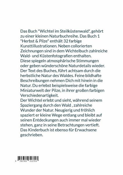 Das Buch "Wichtel im Steilküstenwald", gehört zu einer kleinen Naturbuchreihe. Das Buch 1 "Herbst & Pilze" enthält 32 farbige Kunsttillustrationen. Neben collorierten Zeichnungen sind in dem Wichtelbuch zahlreiche Wald- und Küstenfotografien enthalten. Diese spiegeln atmosphärische Stimmungen oder geben wünderschöne Naturdetails wieder. Der Text des Buches führt achtsam durch die herbstliche Natur des Waldes. Feine bildhafte Beschreibungen nehmen Dich mit hinein in die Natur. Du erlebst beispielsweise die farbige Miniaturwelt der Pilze, in ihrer großen farbigen Verschiedenartigkeit. Der Wichtel erlebt und sieht, während seinem Spaziergang durch den Wald, zahlreiche Wunder der Natur. Neugierig und fröhlich spaziert er kleine Wege entlang und bleibt auf seinen Entdeckungen auch immer mal wieder stehen, ganz in seine Betrachtungen vertieft. Das Kinderbuch ist ebenso für Erwachsene geschrieben.
