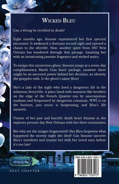 Can a wrong be rectified in death? Eight months ago, Simone experienced her first spectral encounter. It awakened a dormant second sight and opened a chasm to the afterlife. Now, another spirit from 1917 New Orleans has wandered through that passage, haunting her with an intoxicating jasmine fragrance and wicked antics. To escape this mysterious ghost, Simone jumps at a seven-day complimentary Mardi Gras hotel package, unaware there might be an ancestral power behind her decision, an identity she grapples with. Is the ghost's name Bleu? She's a lady of the night who lived a dangerous life in the infamous Storyville. A place lined with mansion-like brothels on the edge of the French Quarter run by unscrupulous madams and frequented by dangerous criminals. WWI is on the horizon, jazz music is burgeoning, and Bleu's life unravels. Visions of her past and horrific death beset Simone as she explores present-day New Orleans with her three roommates. But why are the images fragmented? Has Bleu forgotten what happened the stormy night she died? Can Simone uncover Bleu's murderer and reunite her with her loved ones before it's too late?