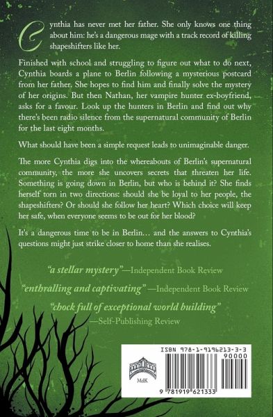 Cynthia has never met her father. She only knows one thing about him: he's a dangerous mage with a track record of killing shapeshifters like her. Finished with school and struggling to figure out what to do next, Cynthia boards a plane to Berlin following a mysterious postcard from her father. She hopes to find him and finally solve the mystery of her origins. But then Nathan, her vampire hunter ex-boyfriend, asks for a favour. Look up the hunters in Berlin and find out why there's been radio silence from the supernatural community of Berlin for the last eight months. What should have been a simple request leads to unimaginable danger. The more Cynthia digs into the whereabouts of Berlin's supernatural community, the more she uncovers secrets that threaten her life. Something is going down in Berlin, but who is behind it? She finds herself torn in two directions: should she be loyal to her people, the shapeshifters? Or should she follow her heart? Which choice will keep her safe, when everyone seems to be out for her blood? It's a dangerous time to be in Berlin... and the answers to Cynthia's questions might just strike closer to home than she realises.