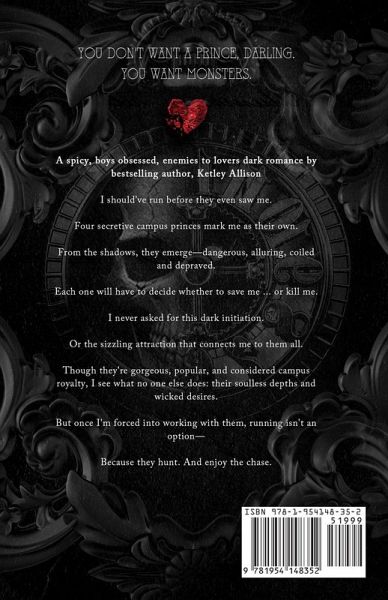 "You don't want a prince, darling. You want monsters." A spicy, boys obsessed, enemies to lovers dark romance by bestselling author, Ketley Allison. I should've run before they even saw me. Four secretive campus princes mark me as their own. From the shadows, they emerge-dangerous, alluring, coiled and depraved. Each one will have to decide whether to save me ... or kill me. I never asked for this dark initiation. Or the sizzling attraction that connects me to them all. Though they're gorgeous, popular, and considered campus royalty, I see what no one else does: their soulless depths and wicked desires. But once I'm forced into working with them, running isn't an option- Because they hunt. And enjoy the chase.