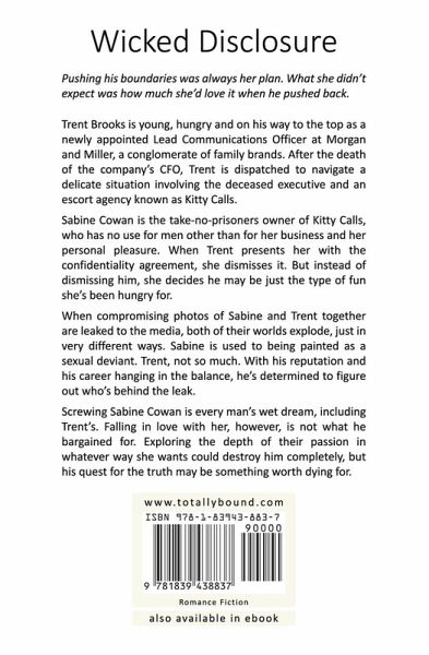 Pushing his boundaries was always her plan. What she didn't expect was how much she'd love it when he pushed back. Trent Brooks is young, hungry and on his way to the top as a newly appointed Lead Communications Officer at Morgan and Miller, a conglomerate of family brands. After the death of the company's CFO, Trent is dispatched to navigate a delicate situation involving the deceased executive and an escort agency known as Kitty Calls. Sabine Cowan is the take-no-prisoners owner of Kitty Calls, who has no use for men other than for her business and her personal pleasure. When Trent presents her with the confidentiality agreement, she dismisses it. But instead of dismissing him, she decides he may be just the type of fun she's been hungry for. When compromising photos of Sabine and Trent together are leaked to the media, both of their worlds explode, just in very different ways. Sabine is used to being painted as a sexual deviant. Trent, not so much. With his reputation and his career hanging in the balance, he's determined to figure out who's behind the leak. Screwing Sabine Cowan is every man's wet dream, including Trent's. Falling in love with her, however, is not what he bargained for. Exploring the depth of their passion in whatever way she wants could destroy him completely, but his quest for the truth may be something worth dying for.
