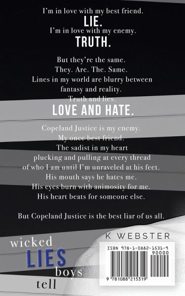 From USA Today Bestselling author K Webster comes an angst-filled, friends-to-enemies-to-lovers MM romance! I'm in love with my best friend. Lie. I'm in love with my enemy. Truth. But they're the same. They. Are. The. Same. Lines in my world are blurry between fantasy and reality. Truth and lies. Love and hate. Copeland Justice is my enemy. My once best friend. The sadist in my heart plucking and pulling at every thread of who I am until I'm unraveled at his feet. His mouth says he hates me. His eyes burn with animosity for me. His heart beats for someone else. But Copeland Justice is the best liar of us all.